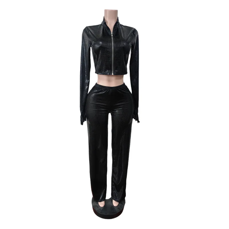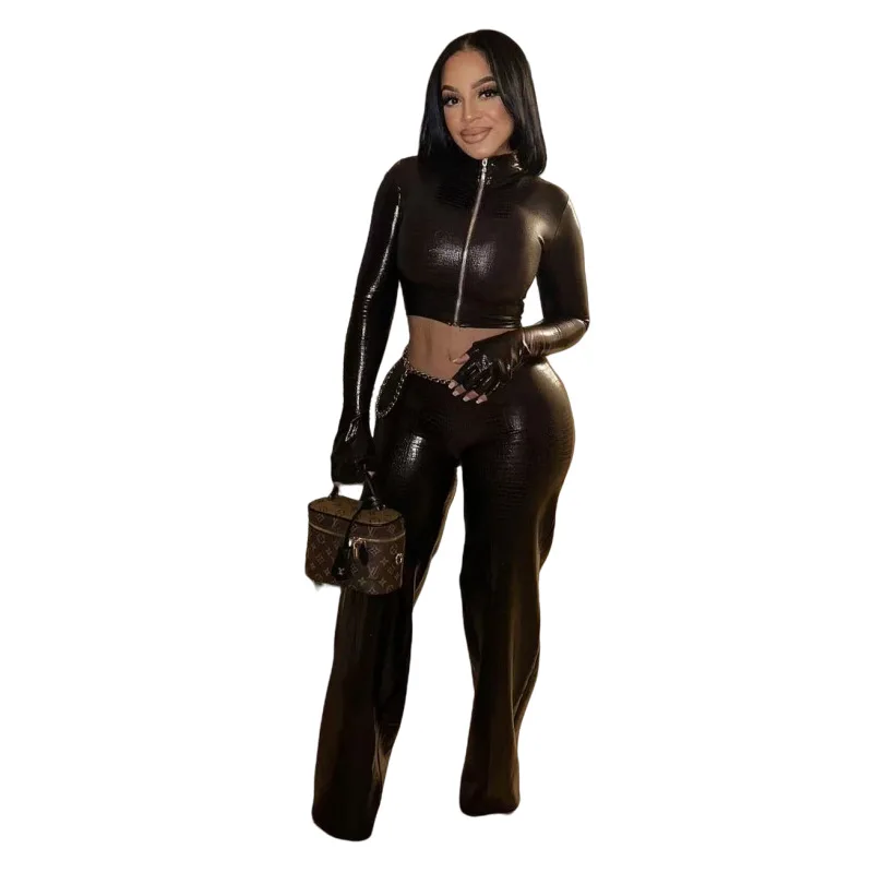 C0990 Wholesale in Stocks Casual PU Leather Solid Color Stretch Belt Gloves Pants Jogger Set Women